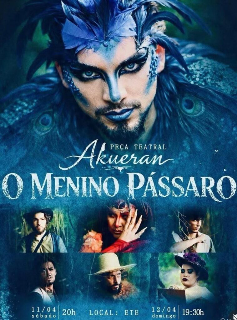 “AKUERAN – O Menino Pássaro” é uma peça que fala sobre liberdade e identidade. Ela conta a história de um menino que se sente diferente de todos ao seu redor, como se tivesse nascido para voar, mas vive em um mundo que tenta prendê-lo e moldá-lo.Ao longo da história, ele passa por uma jornada de autoconhecimento, enfrentando medos, julgamentos e limites impostos pela sociedade. A peça usa uma linguagem poética e simbólica para mostrar que ser diferente não é um problema, mas uma força. No fim, é um espetáculo que convida o público a refletir sobre quem a gente realmente é e até onde estamos dispostos a ir para sermos livres.” O espetáculo acontece nos dias 11 e 12 de Abril, Sábado (20 hs) e Domingo, (19.30 hs) no Teatro da Escola Técnica ETE.